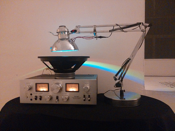 Interferenze AudioVisive is a work based on the “Cymatics”, the study ofthe vibration’s effects on the matter. On a small water mirror, the waves generated by the vibrations interfere with each other, creating geometric patterns on the surface. The ripples in turn, reflect the rays of light making them interfere and thus creating visual interference patterns, which as holograms, can trick our perception.